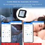 Adapta tu entorno al máximo con el sensor de temperatura y humedad de alta precisión integrado en el controlador. Monitorea las condiciones del ambiente en tiempo real y utiliza el modo Cómodo, que ajusta automáticamente la temperatura y la humedad para crear un espacio ideal según tus preferencias. Además, podrás configurar límites en el rango de temperatura, perfecto para controlar condiciones térmicas en oficinas, locales comerciales o habitaciones específicas.