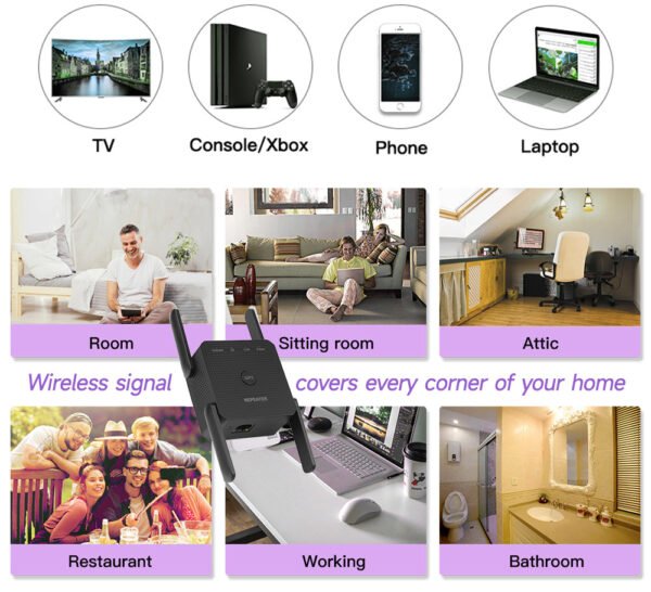 Este repetidor es compatible tanto con redes WiFi 2.4GHz como 5GHz, asegurando una conexión eficiente en diversas condiciones. Su tecnología avanzada se adapta a múltiples dispositivos y asegura un rendimiento fluido. Alcanza una máxima cobertura que elimina las zonas sin señal y te ofrece la velocidad que necesitas para un entorno digital ininterrumpido.