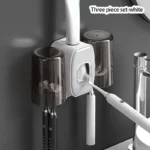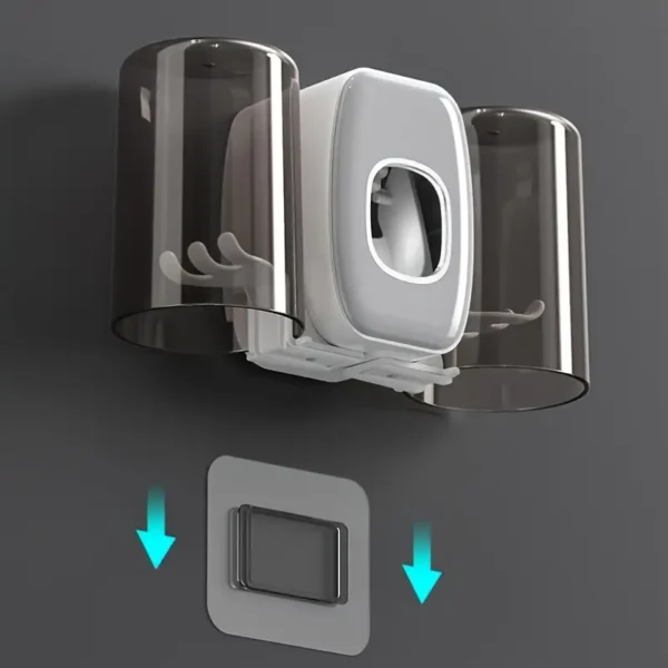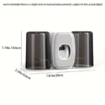 Mantén tu baño limpio y organizado con este soporte con dispensador automático de pasta de dientes y esterilizador de cepillos, diseñado para instalarse en la pared sin necesidad de perforaciones. Incluye 2 vasos magnéticos y espacio para colocar los cepillos de toda la familia.